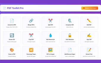 PDF Toolkit Pro är en omfattande tillägg för Chrome som erbjuder 24 kraftfulla verktyg för hantering och redigering av PDF-filer. Den fungerar helt offline, vilket innebär att ingen internetanslutning behövs och ingen data laddas upp, vilket garanterar fullständig integritet. Användare kan konvertera, slå samman, dela, komprimera och annotera PDF-dokument, samt lägga till signaturer och redigera metadata. Med en användarvänlig och ren gränssnitt är det lätt att navigera mellan de olika funktionerna.